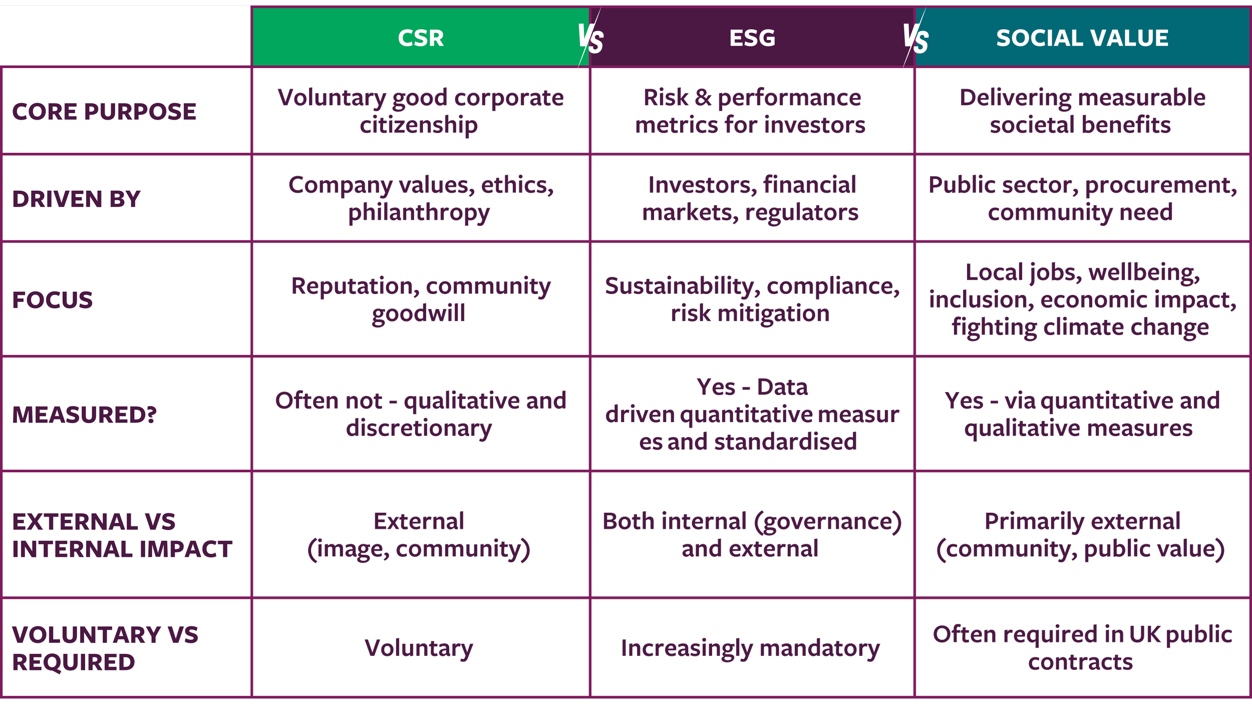 While ESG is about risk management, transparency, and investor confidence, Social Value focuses on delivering tangible benefits to people, communities, and places, particularly through procurement, service delivery, and operations.